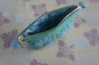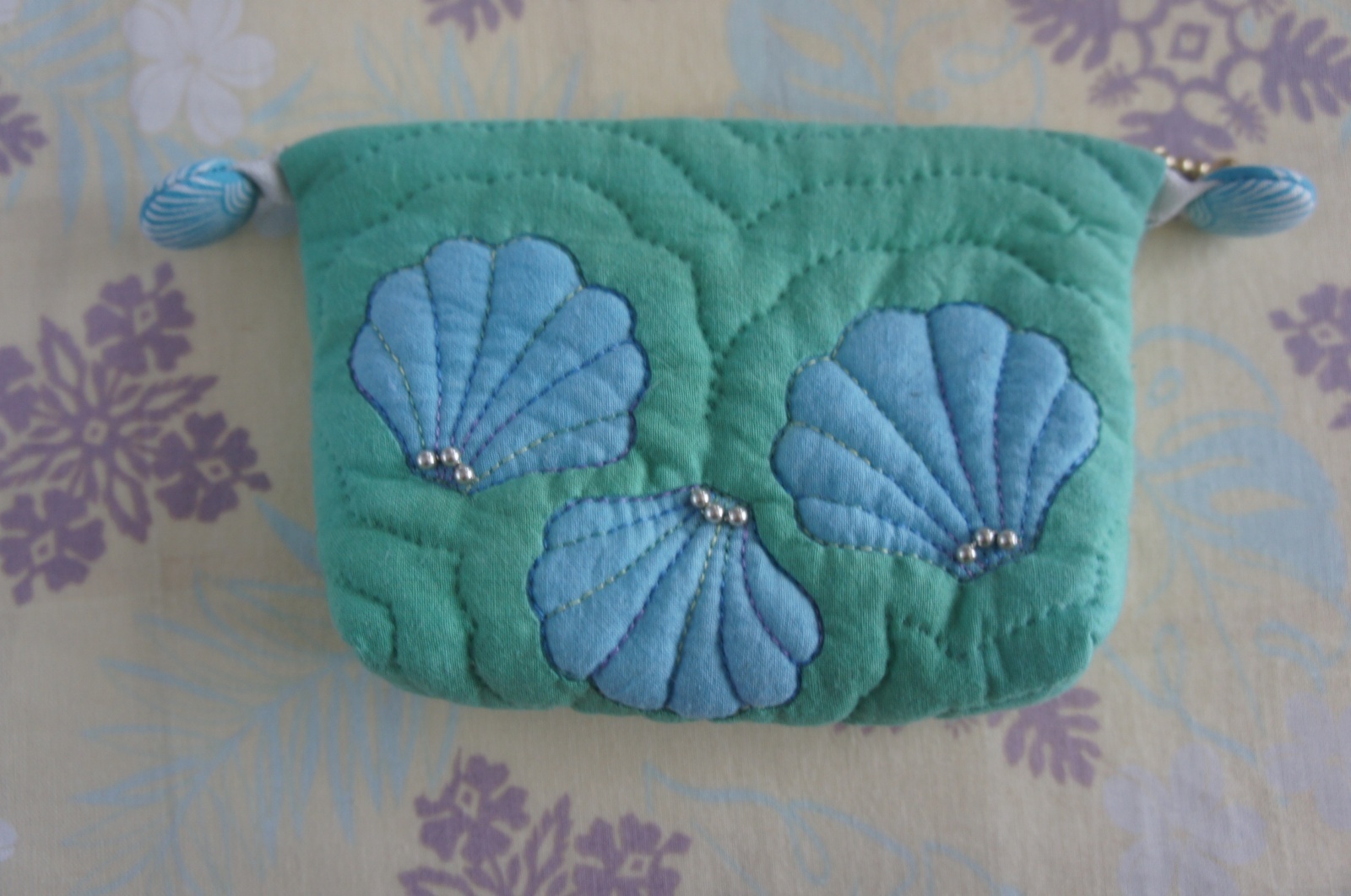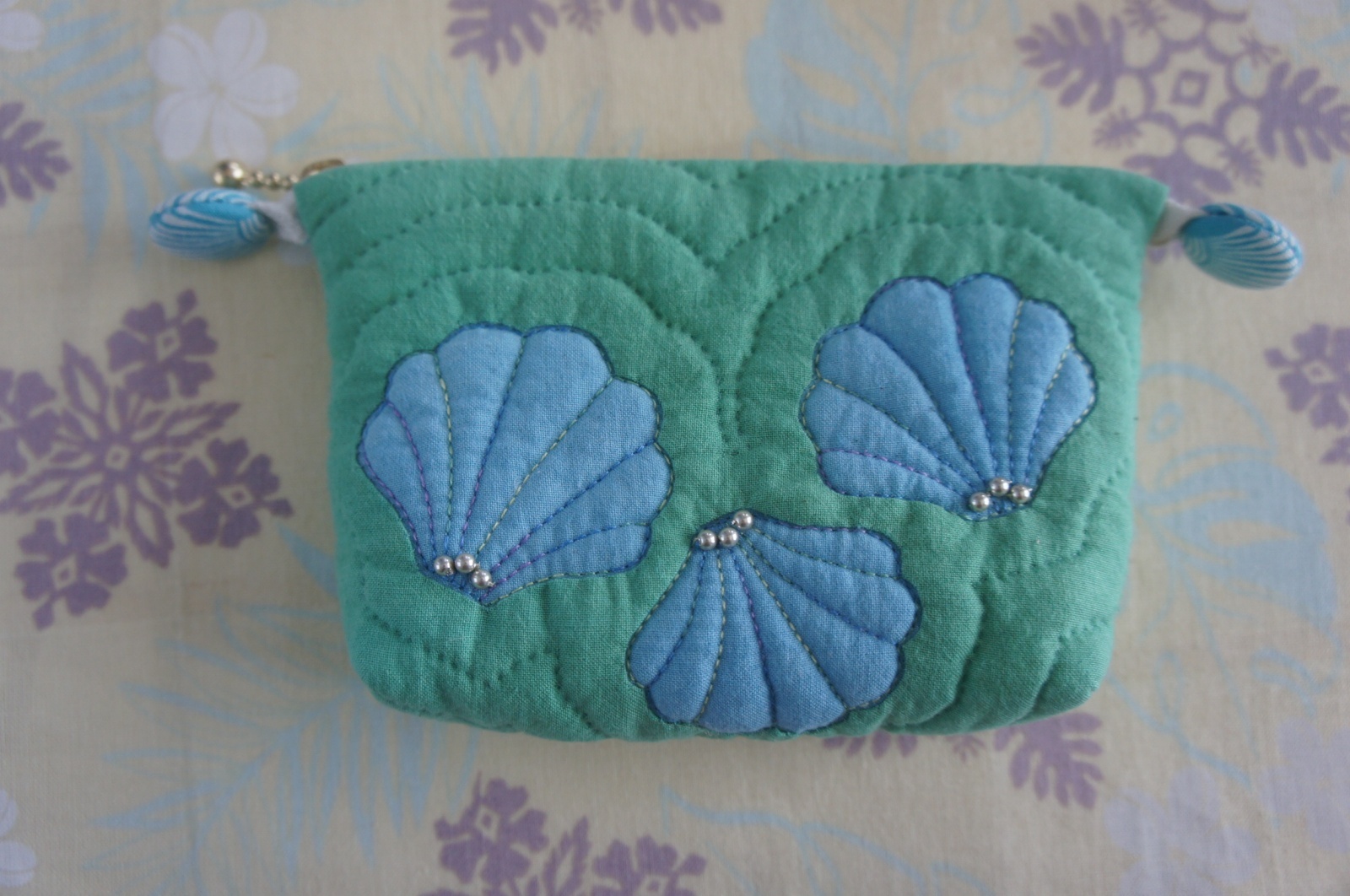 リバースアップリケのシェルのポーチです。手染めOSANAIさんの生地を使用しています。