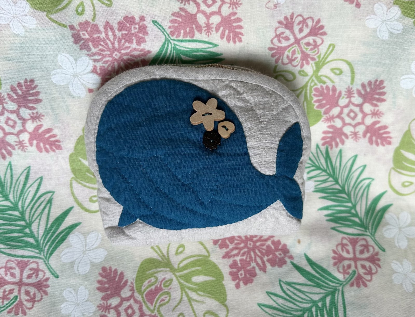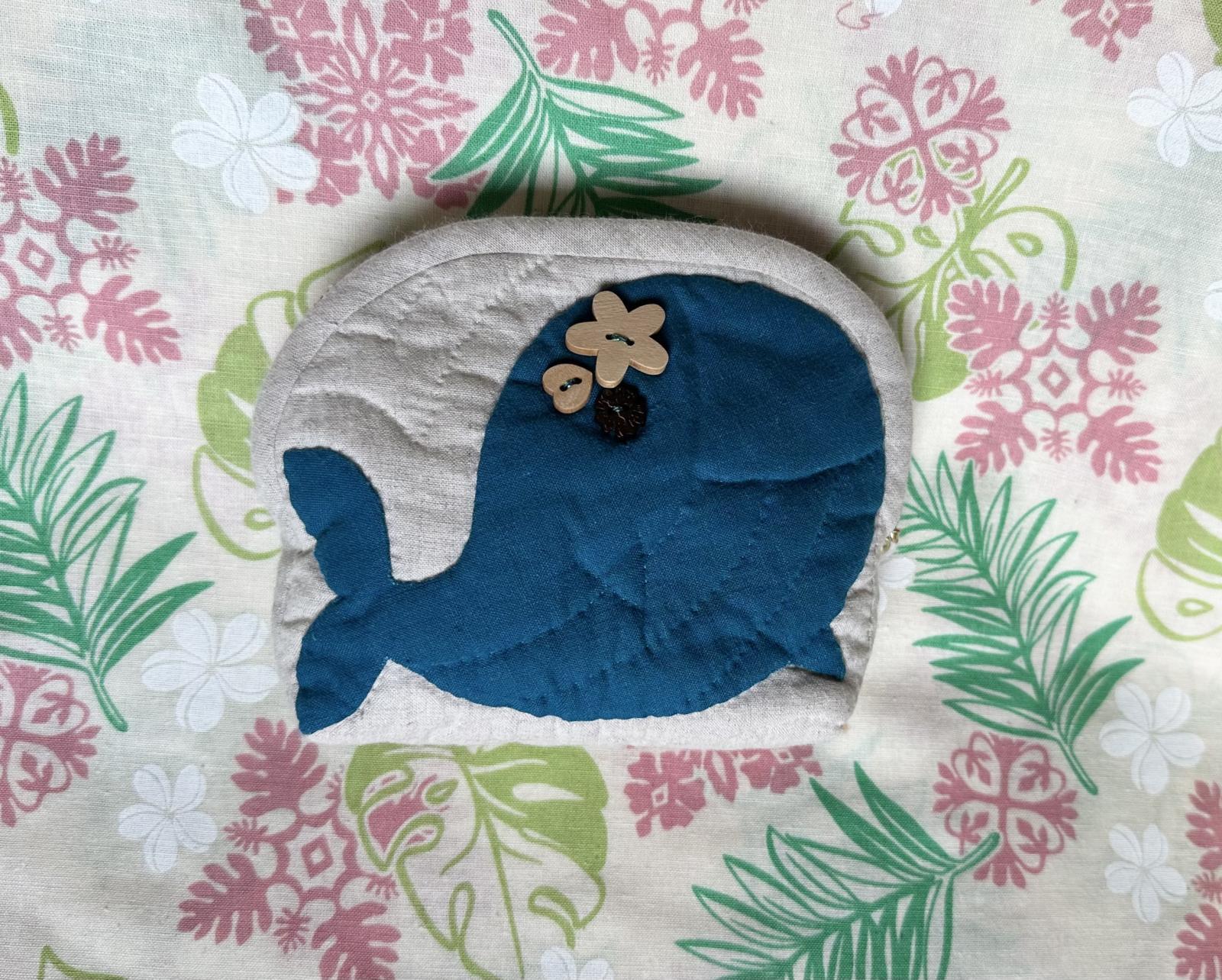デザイン製作chie クジラのアップリケにウッドボタンを付けたデザインのポーチです。鎌倉にあるスワニーさんのオリジナル生地(綿麻布)を使っています。化粧品や小物を入れるポーチとしてお使いいただけます。