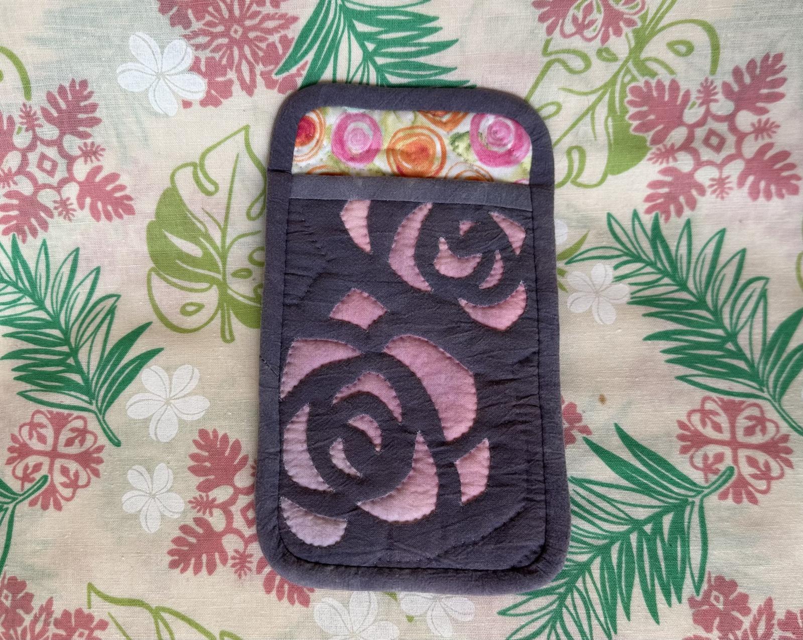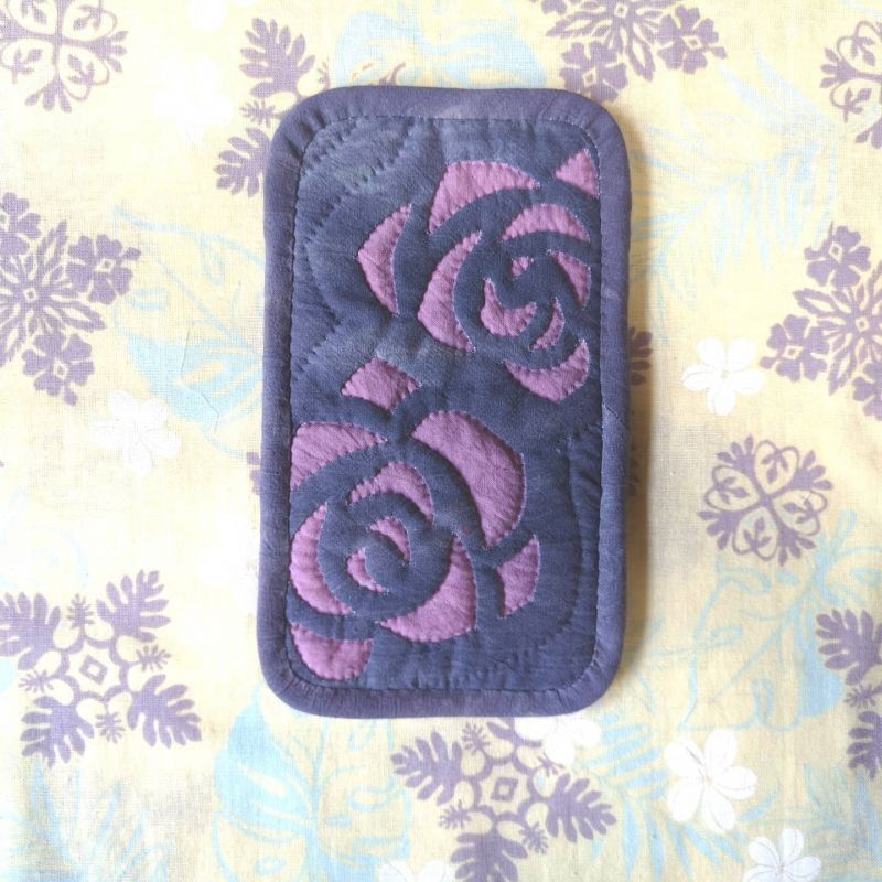 紫の薔薇をリバースアップリケでデザインしたメガネケースです。手染めosanaiさんの生地を使っています。