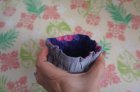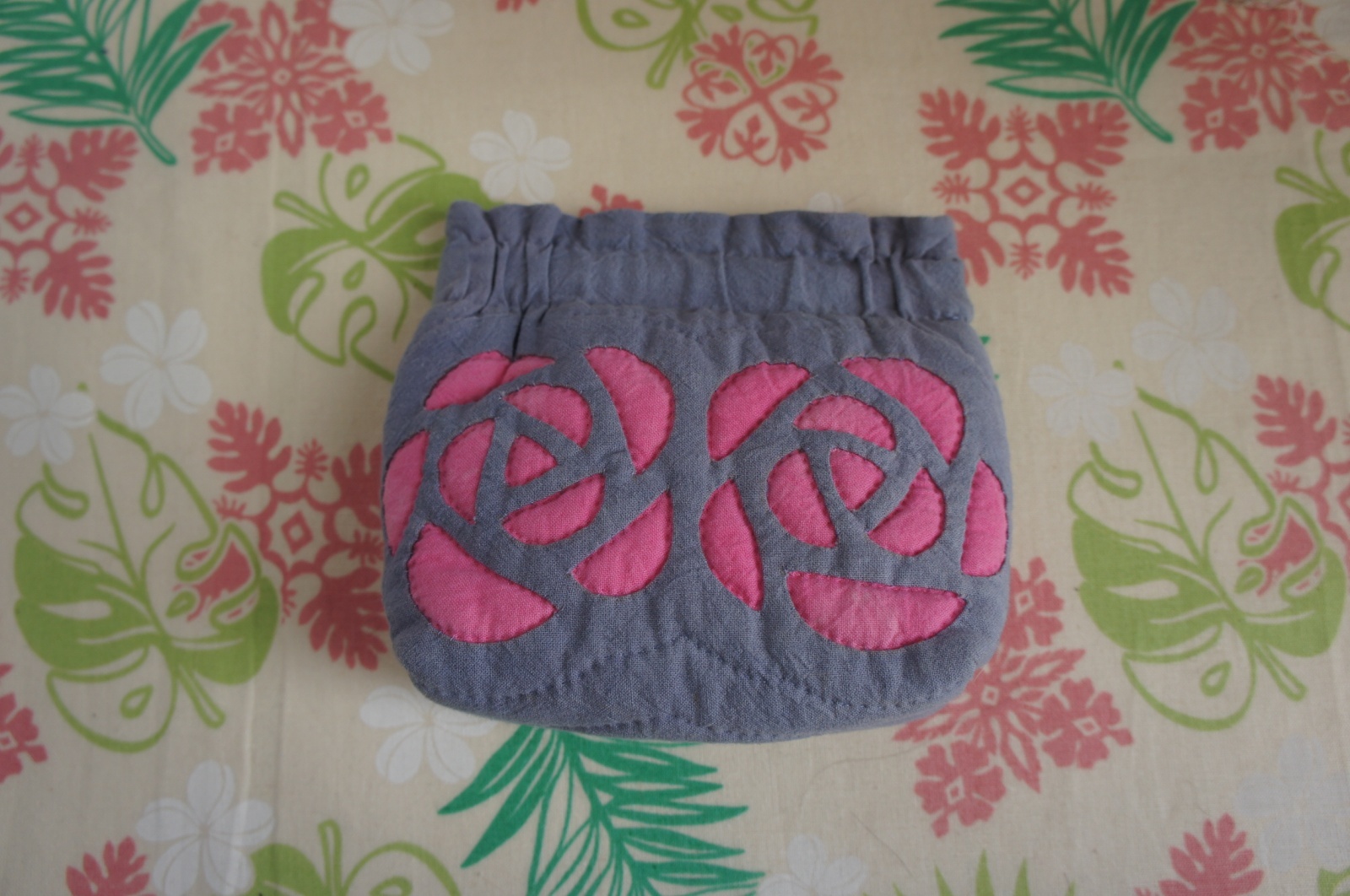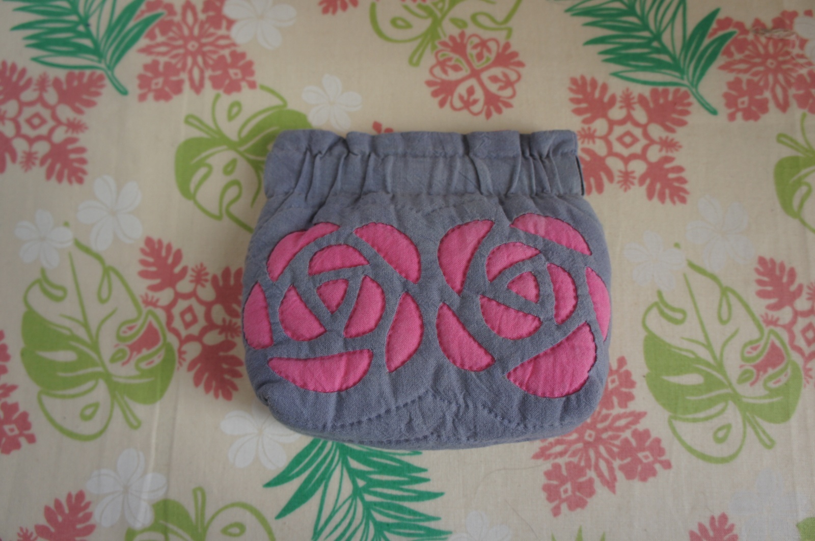 バネ口金のポーチです。アップリケはリバースアップリケです。手染めOSANAIさんの生地を使っています。